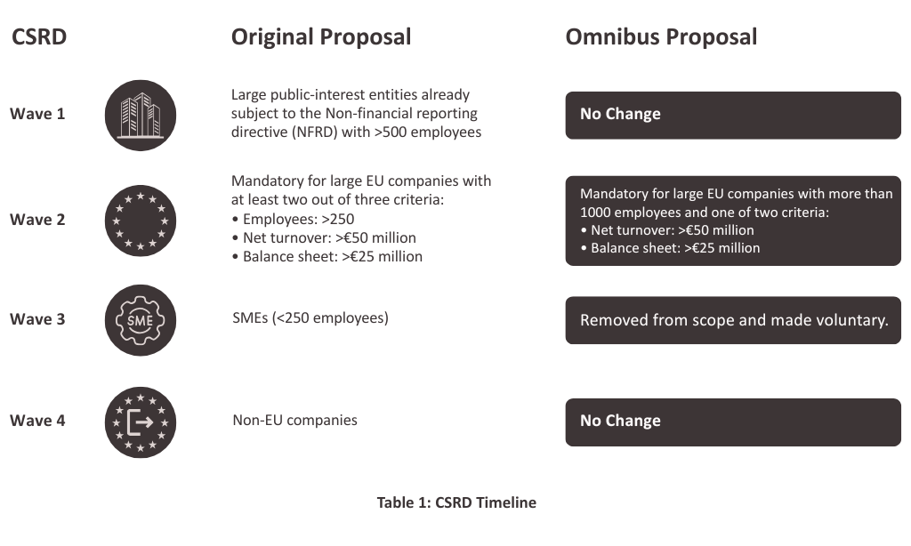 The Corporate Sustainability Reporting Directive (CSRD), which came into force in January 2023, was designed to improve the existing Non-Financial Reporting Directive by significantly expanding the scope of sustainability reporting. Considering the potential Omnibus package, reporting obligations would remain relevant to large companies, although the definition of a large company has been revised in the proposal. Hence, reducing the scope to about 80% of the companies included in the original proposal. Companies outside the scope may still voluntarily report. See table 1 for a summary of the changes.
